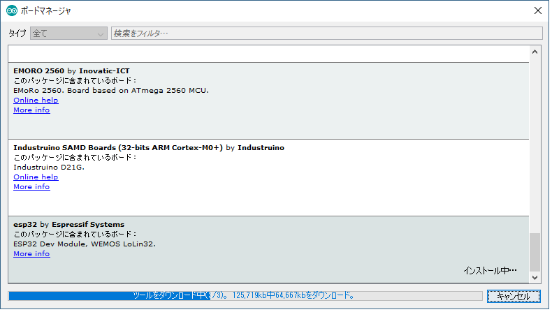このウィンドウの最後に、「esp32 by Espressif Systems」にESP32関連のシステムががあって、ここを選択すると、