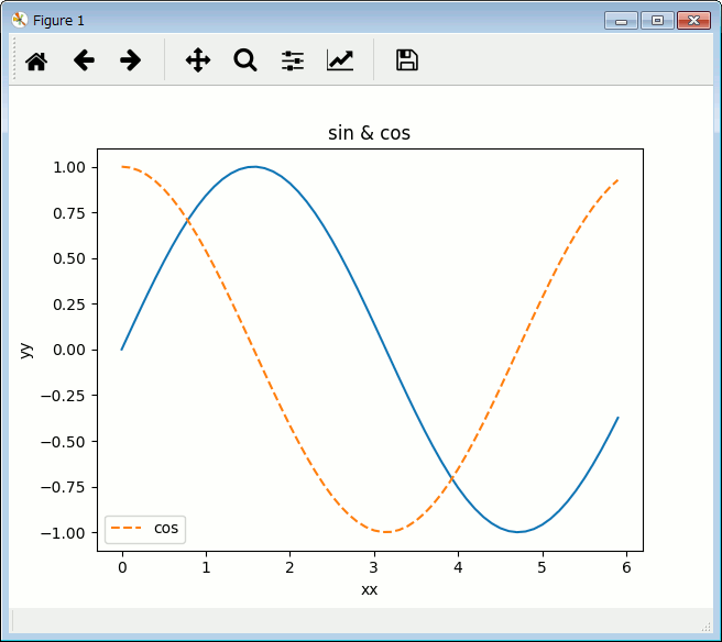 import numpy as np import matplotlib.pyplot as plt # pltを使うこと x = np.arange(0, 6, 0.1) plt.subplot(2, 1, 1) # 2行に分割, 1列に分割, 1何番目のプロットを指定) y = np.sin(x) plt.plot(x,y) # プロット用データを設定 plt.subplot(2, 1, 2) # 2行に分割, 1列に分割, 2何番目のプロットを指定) y = np.cos(x) plt.plot(x,y, linestyle="--", label="cos") plt.plot(x,y) # プロット用データを設定 plt.show() #表示されると、plt内容はクリア