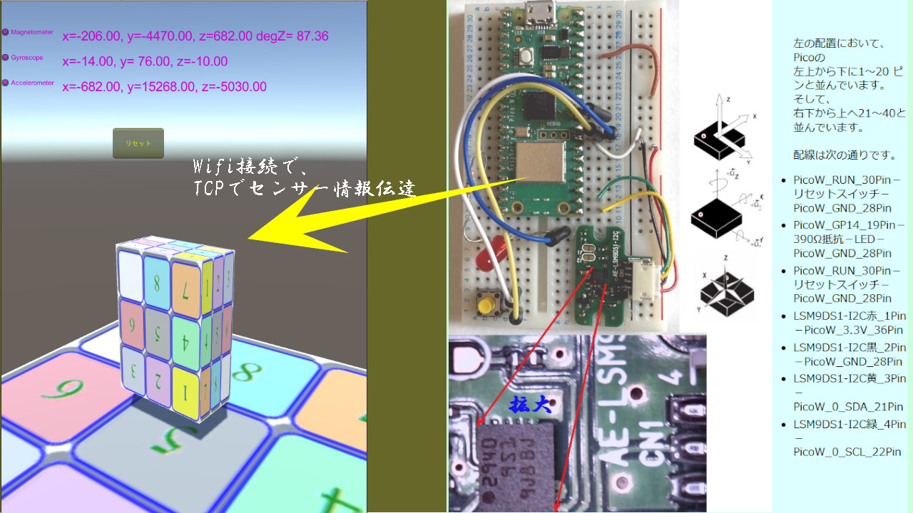 ブレッドボード上に、Raspberry Pi Pico WとLSM9DS1(9軸センサ)モジュールを取りつ付けています。