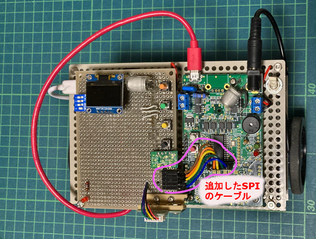[Raspberry Pi 3 Model A+]と[UMEHOSHI ITA]を乗せたモータ付き台車で、 拡張ボードでSPI用のコネクタを追加した回路結線図&配置図 ![]() |